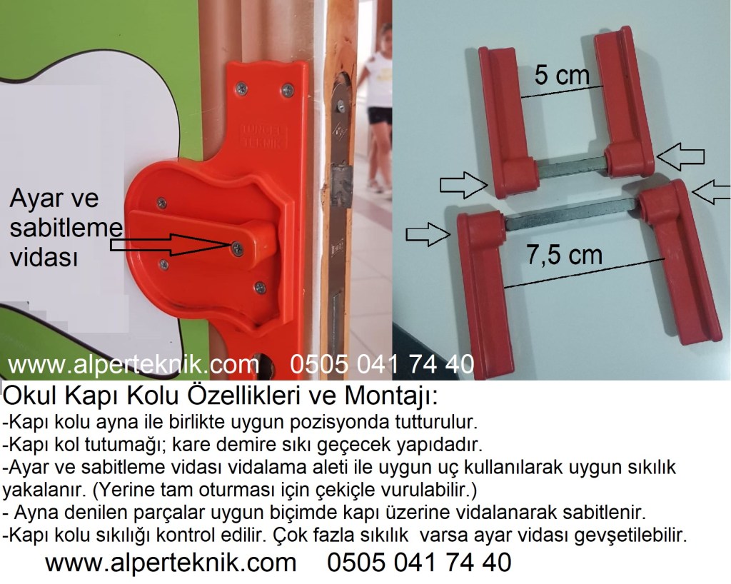 Okul kapı kolu; düz şekilde olup öğrenciye zarar vermez. Öğrenci oyun amaçlı kapı ve kapı kolu ile oynayamaz. Kapı menteşeleri, kilit vb. uzun ömürlü olur.