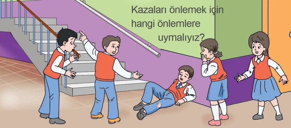 Evde, okulda ve çevremizde kesik, yaralanma, boğulma, zehirlenme, yanma gibi kazalar meydana gelebilir. Kazalar, kişilerin dikkatsiz davranışları sonucu olur. Günlük hayatta meydana gelebilecek kazaları önlemek için önceden tedbir almalıyız.