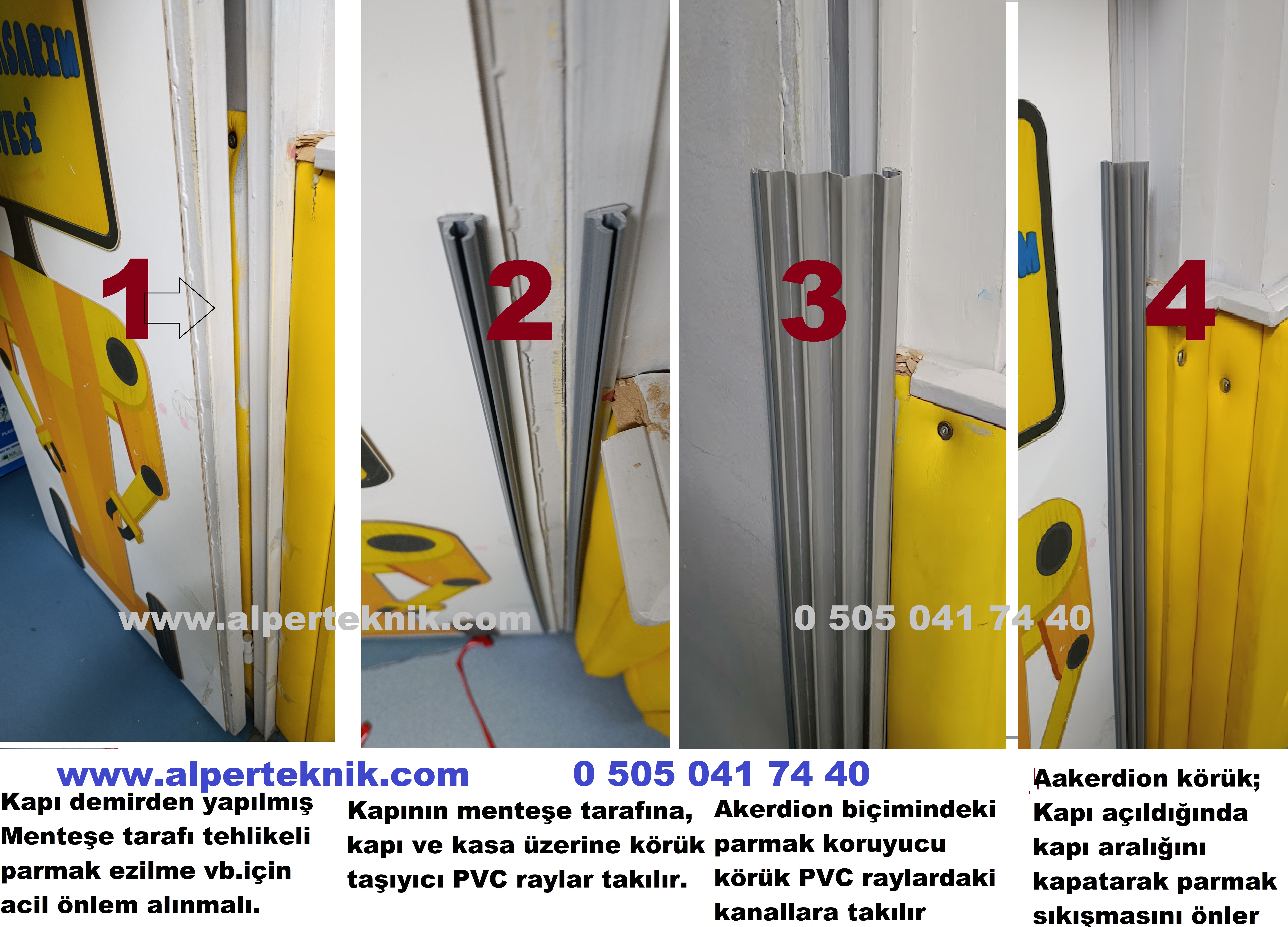 Kapı arası parmak koruyucu ürünler, kapı açık ya da kapalı da olsa parmak sıkışmalarını engelleyerek tam koruma sağlar. Akardıon körükler sağlamlık olarak yıllarca koruma sağlar.