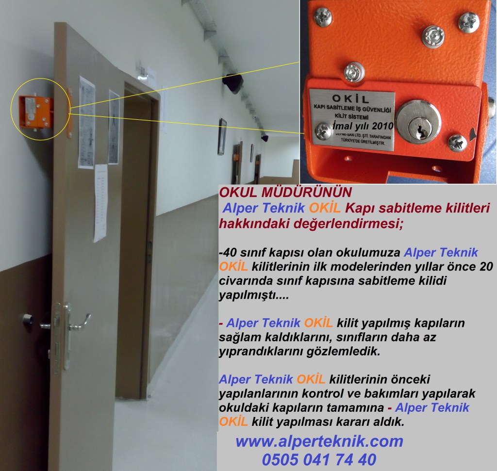 Kapı Sabitleme Kilit Sistemi; sınıf kapılarının neden olduğu yaralanma ve travmaları önleyerek öğrencilerimizin daha güvenli ortamlarda eğitim görmelerini sağlamak, öğrenciler tarafından bir oyun aracı olarak kullanıldığı için çok çabuk yıpranan, sürekli bakımı yapılan ve her yıl okullarımızı milyonlarca lira zarara uğratan sınıf kapılarının ve duvarlarının zarar görmesini engellemek; okullarımızın ve ülkemizin ekonomisine katkıda bulunmak, amaçlarıyla geliştirilmiş bir kilit mekanizmasıdır.